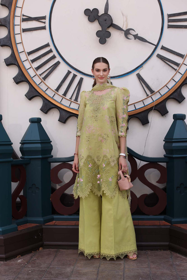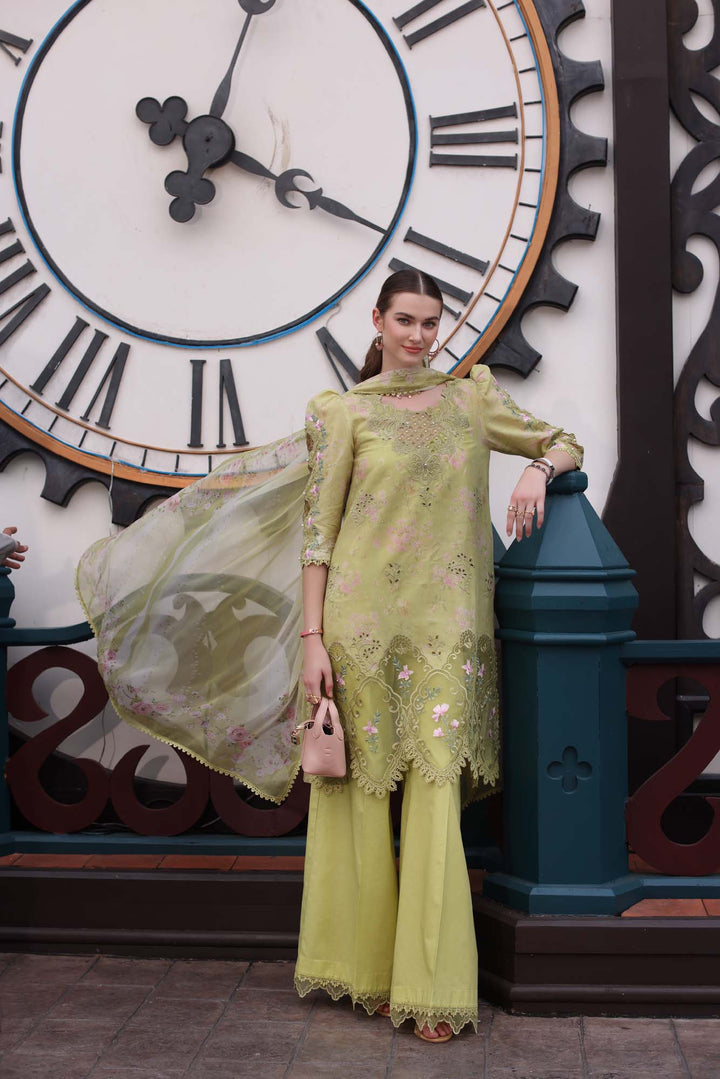 Fresh, playful, and full of personality, this lime green ensemble with sharp pink accents is a vibrant interplay of prints, embroidery, and contrasting textures. The base features delicate chikankari work, brought to life with layers of embroidery that add structure without losing the fun. A broad schiffli border on organza enhances the design, adding definition and flair. The look is completed with a chiffon dupatta that bursts with digitally printed tropical florals.