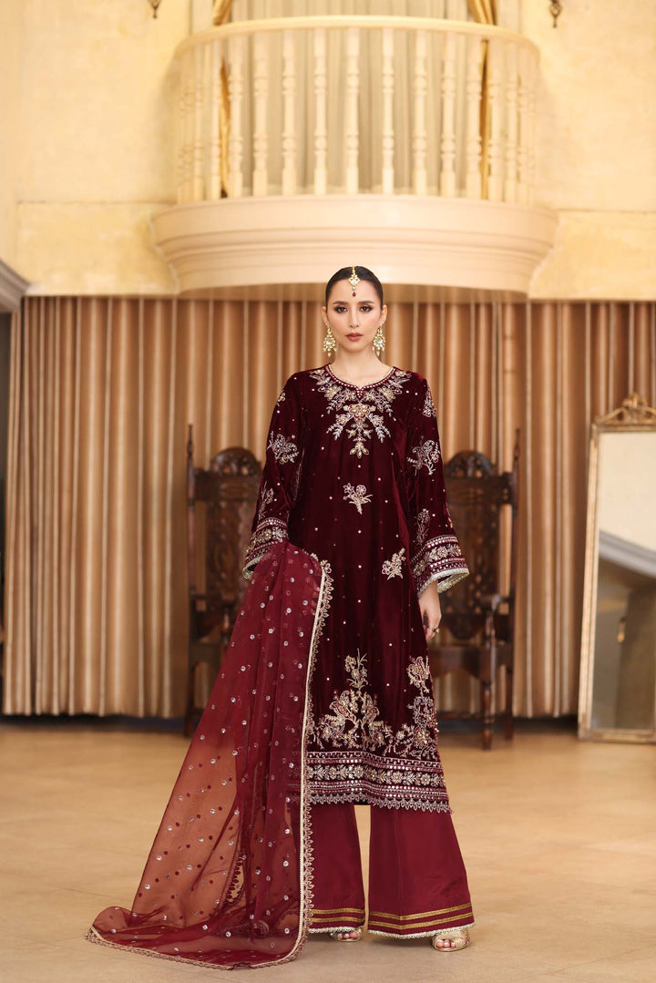 Drape yourself in opulence with this breathtaking deep maroon velvet ensemble, a masterpiece that embodies timeless luxury and meticulous craftsmanship. The plush velvet fabric radiates warmth and grandeur, making it the perfect choice for festive and winter occasions.
