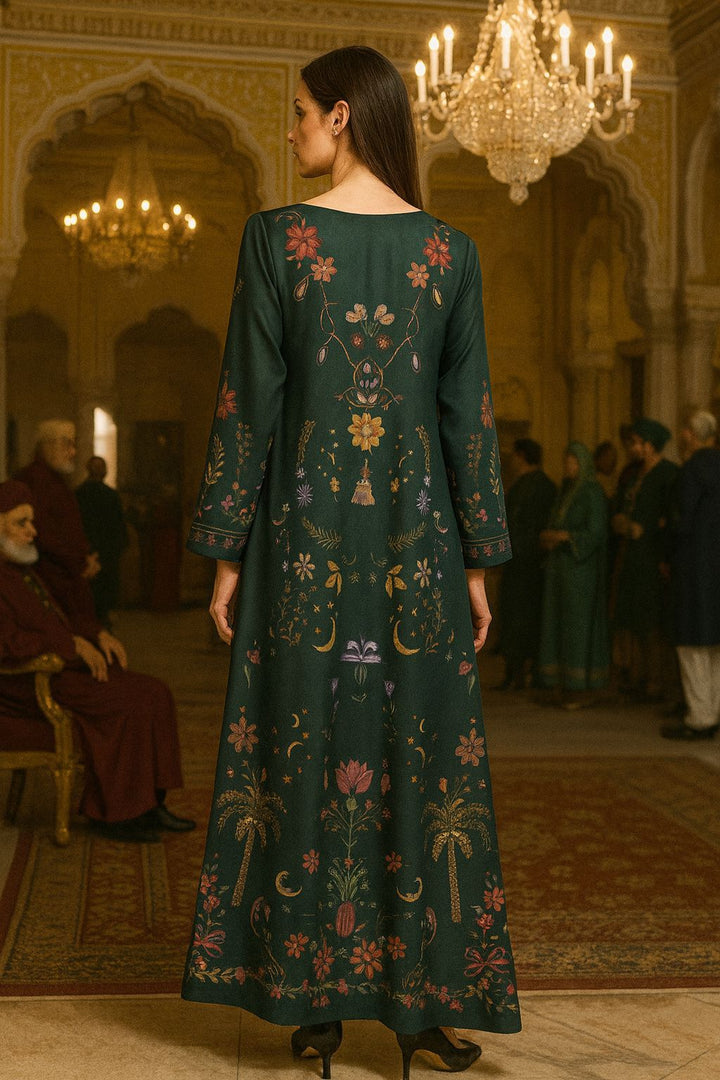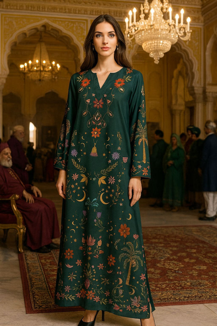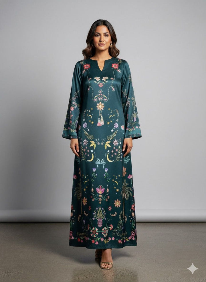 Step into elegance with this stunning deep emerald kaftan, adorned with intricate botanical motifs that celebrate nature’s charm.