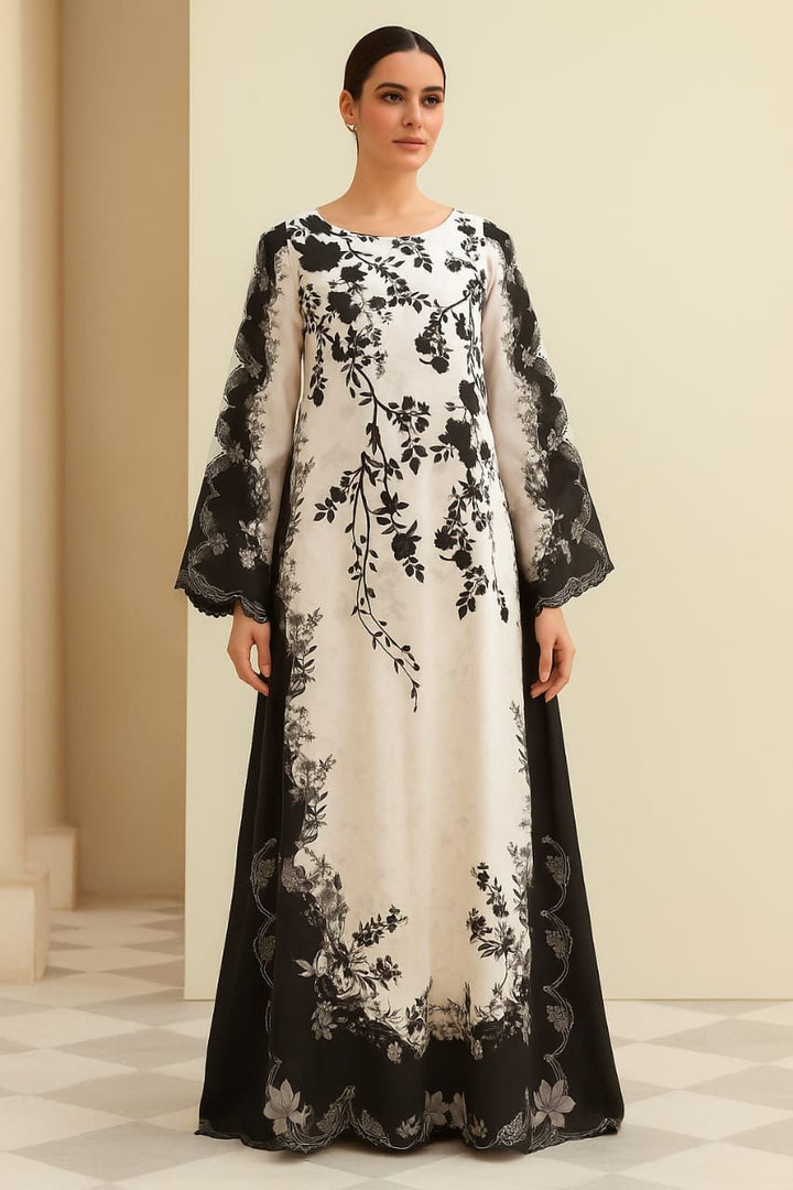 A timeless black and white floral kaftan that embodies effortless sophistication. The monochrome palette brings understated charm, while the flowing silhouette ensures comfort with refined elegance perfect for any occasion.