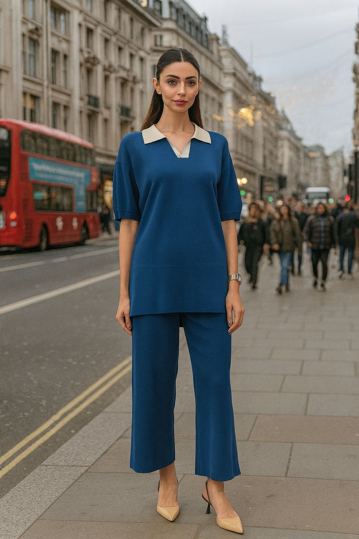 This knitted spring co-set features a vibrant collar top with 3/4 sleeves  paired with loose cut, slightly high rise knitted trouser for ultimate comfort.