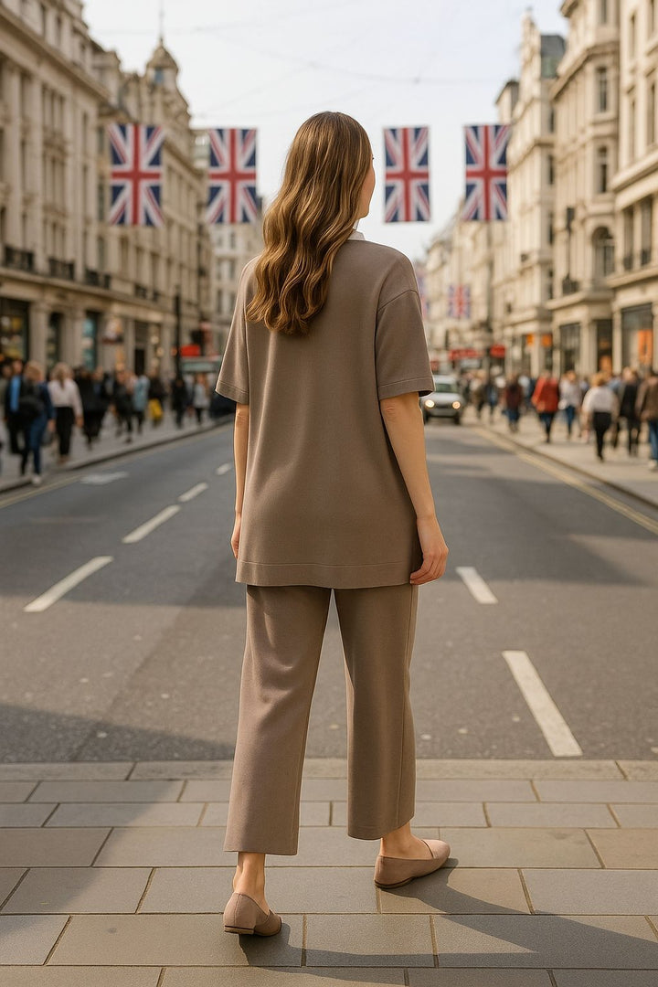 This knitted spring co-set features a muted color collar top for a subtle touch with 3/4 sleeves  paired with loose cut, slightly high rise knitted trouser for ultimate comfort.