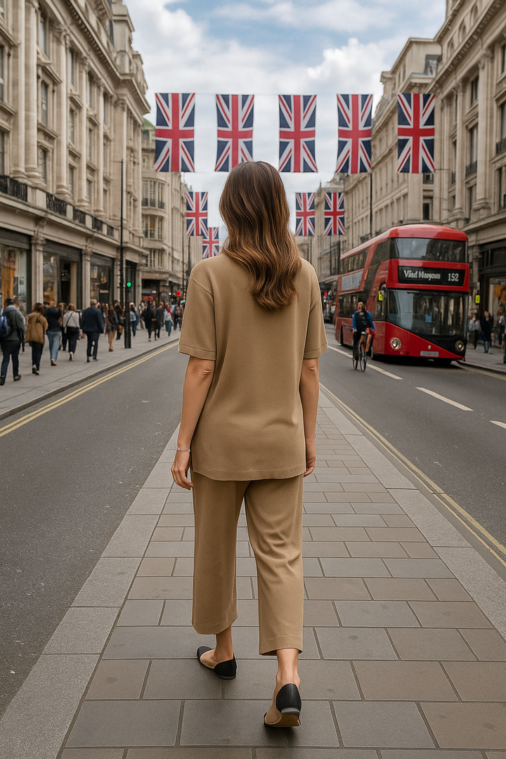 This knitted spring co-set featuring an earthy color collar top for a subtle touch with 3/4 sleeves paired with loose cut, slightly high rise knitted trouser for ultimate comfort.
