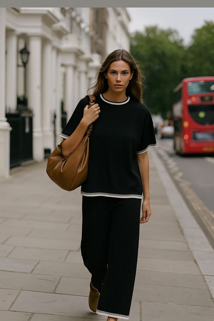 This  black knitted co-ord set is a chic and cozy ensemble designed for effortless style and comfort during spring seasons. This two-piece set includes a matching top with round neckline and bottom crafted from premium quality knit, ensuring  softness, and durability. Perfect for lounging at home, casual outings, or even layering for a stylish look.