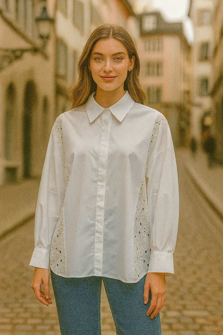 Crafted from durable cotton, this white shirt blends clean, minimal tailoring with intricate lacework on the panels, creating a refined balance of structure and femininity — perfect for both casual and semi-formal wear.