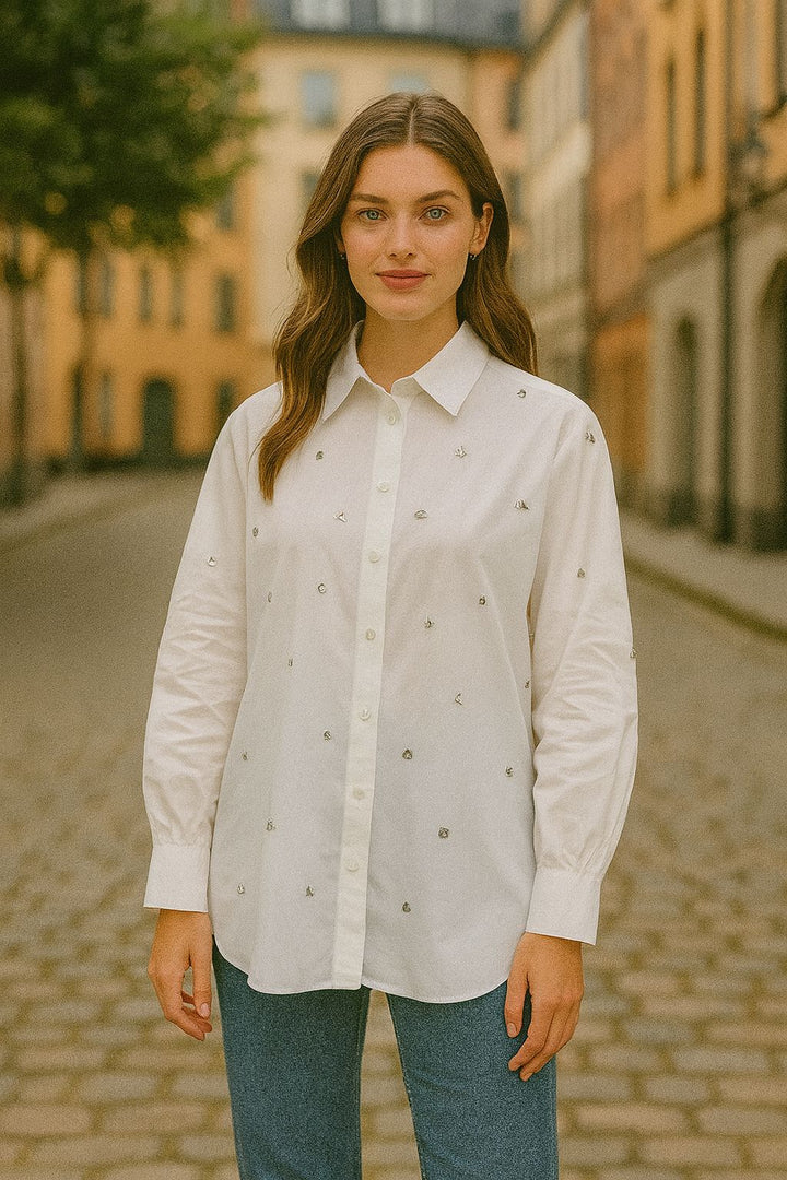 A contemporary white button-down shirt elevated by sparkling, scattered rhinestone embellishments. This stylish top features dramatic, ruched voluminous long sleeves and an oversized fit, creating a chic and modern statement piece that blends classic tailoring with bold details.