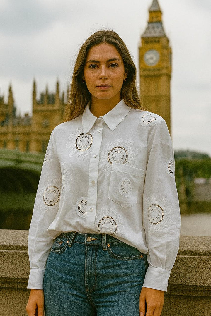 This white shirt boasts a unique design with elaborate circular cutwork embroidery meticulously placed across the body and sleeves, giving it a distinctive and airy feel.