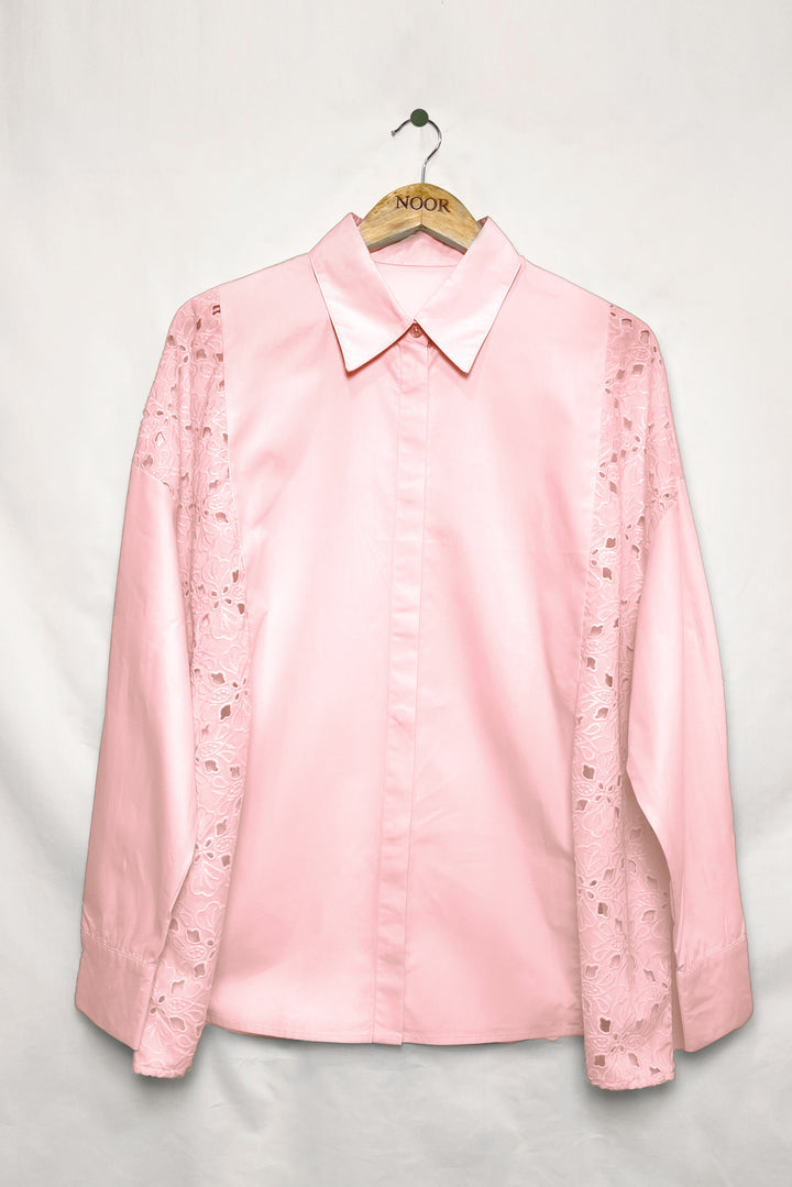 Crafted from durable cotton, this pink shirt blends clean, minimal tailoring with intricate cutwork on the panels, creating a refined balance of structure and femininity — perfect for both casual and semi-formal wear.