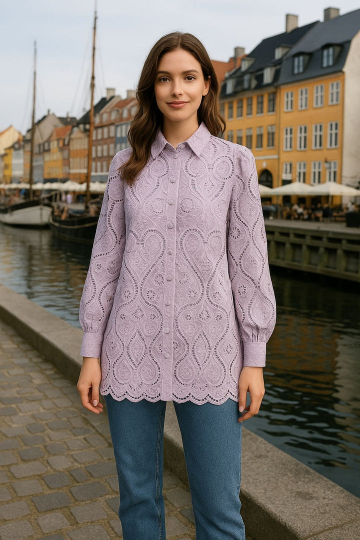A dreamy lilac shirt adorned with intricate schiffli embroidery and fabric-covered buttons, offering a romantic and refined statement look.